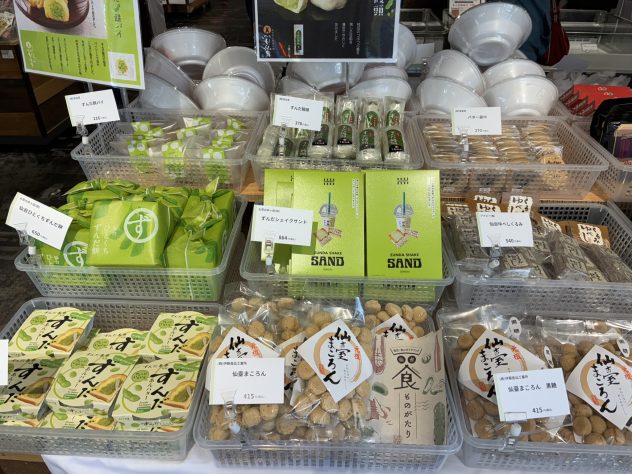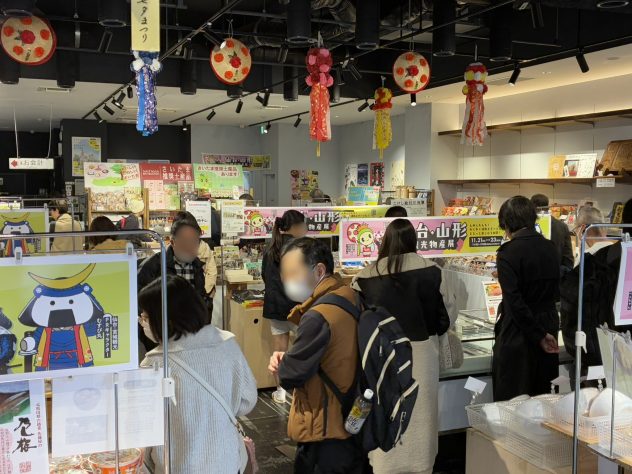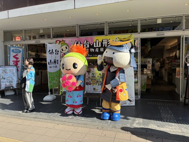 11月21日~23日の3日間「仙台・山形観光物産展」を開催しました!初日は晴天に恵まれ、開館と同時にゆるキャラ「はながたベニちゃん」「むすび丸」が登場し、店頭は笑顔でいっぱい。仙台伝統工芸・松川だるまは初日の午前中に完売するほどの人気ぶりでした。会場では仙台名物「笹かまぼこ」や「ずんだ餅」商品、山形の土産品が好評。特に仙台のバター最中は女性のお客様に大人気で、2日目に完売となりました。さらに、2日目の「主婦の店さいち」の「秋保おはぎ」は販売開始前から行列ができ、わずか20分で完売!その熱気にスタッフも驚きです。試食やワインの有料試飲も好評で、イートインスペースは終日賑わい、東北の味覚をゆっくり堪能する姿が見られました。