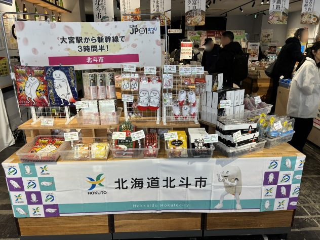大宮駅から新幹線で約3時間30分と意外に近い北斗市のPRブースも大盛況 !市の公式キャラクター「ずーしーほっきー」が登場すると、お子様連れやファンの方々を中心に喜ばれました 。アンケート協力で貰える限定グッズも大人気で、北斗市の魅力を身近に感じていただける機会となりました。